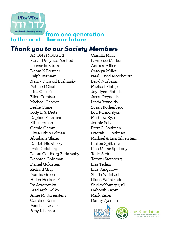 Life and Legacy ™ is a collaborative effort to ensure the future of our Jewish Community. This is achieved through a unique partnership among The Foundation of the Jewish Federation of Greater Rochester, The Harold Grinspoon Foundation and many local Jewish organizations and synagogues, including Temple Beth El.