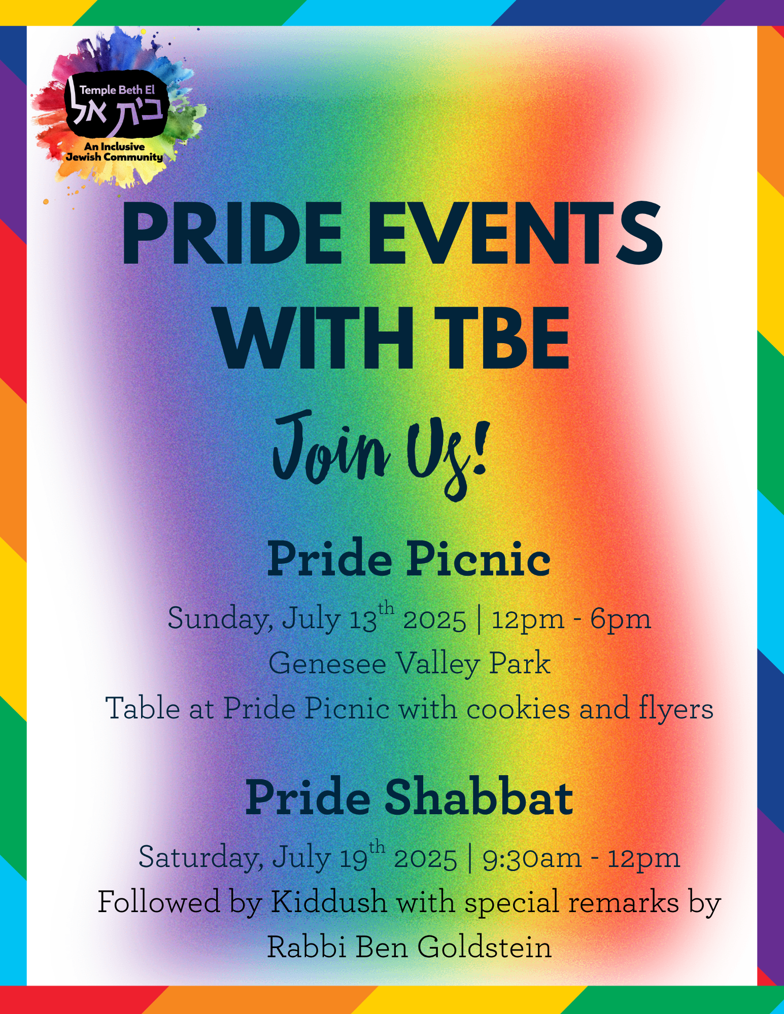This month, join us in celebrating Pride! Come check out our Pride Picnic and Pride Shabbat which are both being held in July.