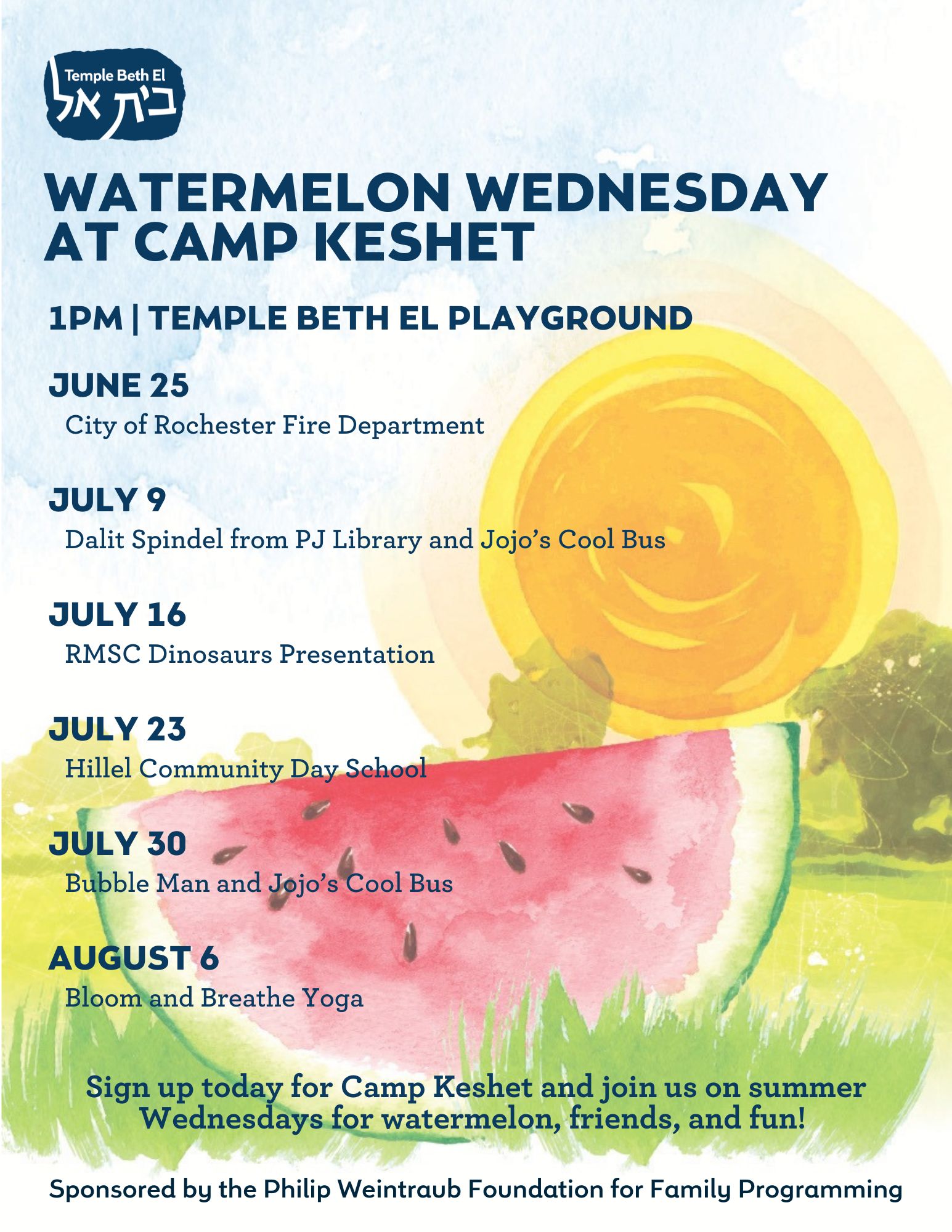 August 6, 2025 @ 1:00 pm – Watermelon Wednesday at Camp Keshet 1pm | Temple Beth El Playground Join other young families for watermelon, friends, and fun! August 6 Bloom and Breathe Yoga Sponsored by the Philip Weintraub Foundation for Family Programming