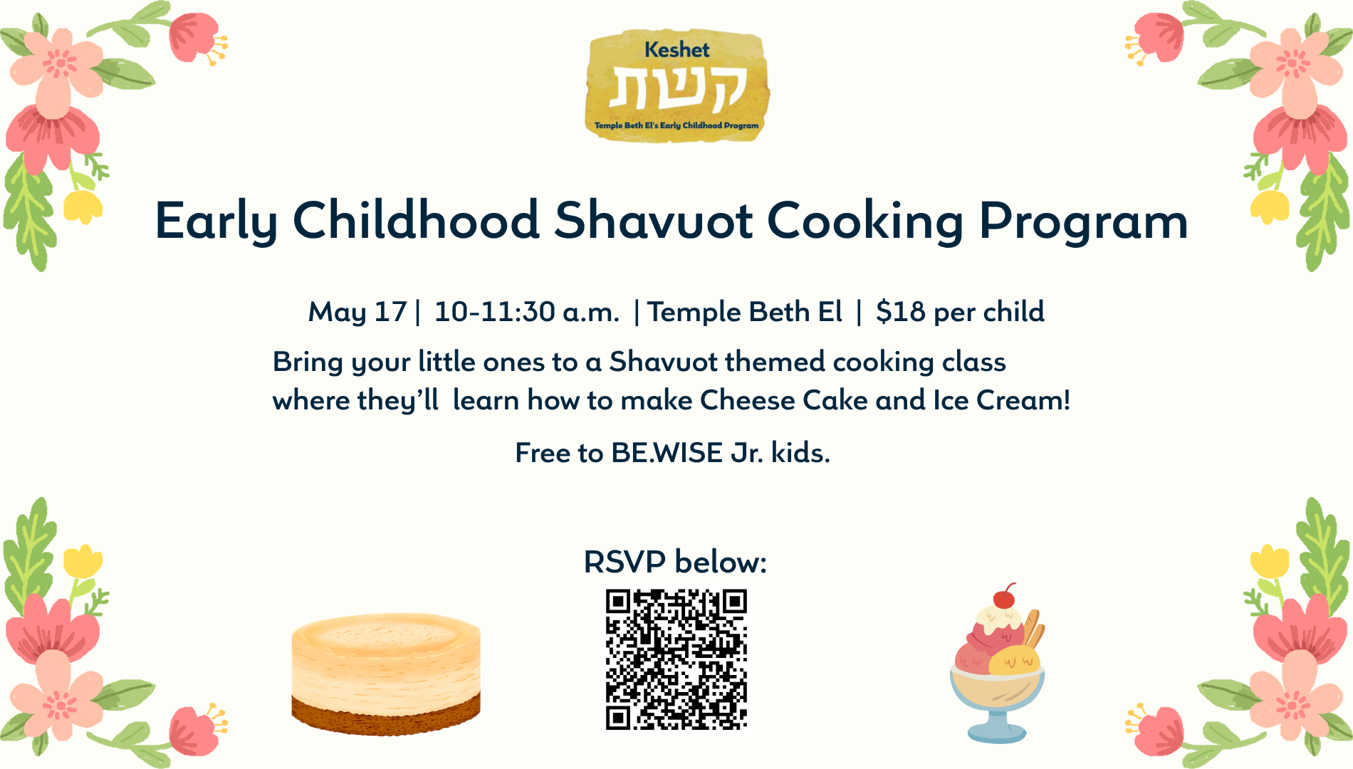 Bring your little ones to a Shavuot themed cooking class where they’ll learn how to make Cheese Cake and Ice Cream!