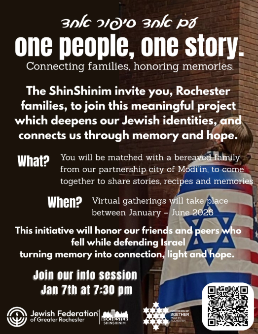 You are invited January 7 at 7:30 p.m. to honor those who have fallen and to turn memory into connection with our ShinShinim program. Learn how this meaningful project provides light and hope while deepening our Jewish identities.