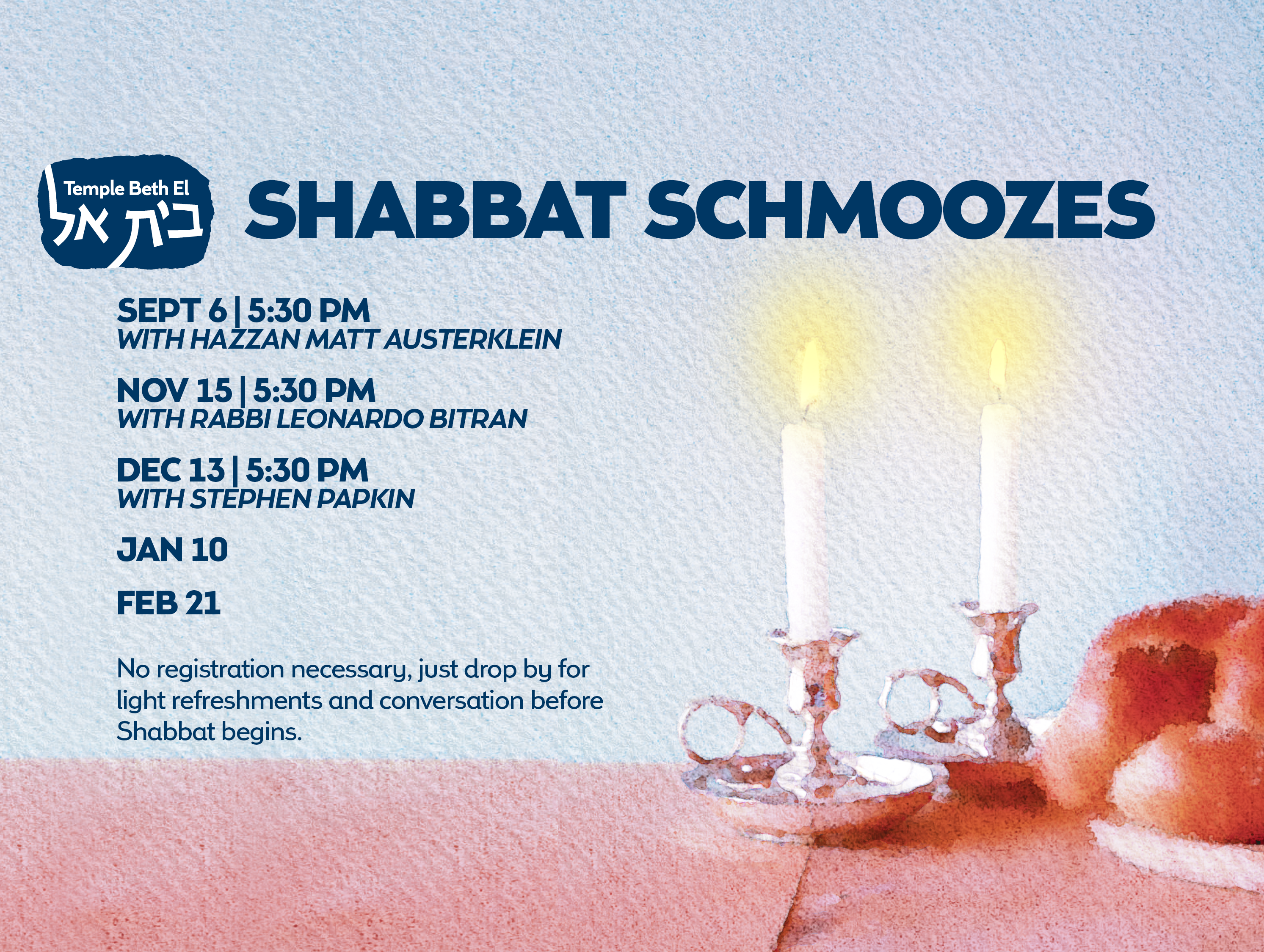 No registration necessary, just drop by for light refreshments and conversation before Shabbat begins.