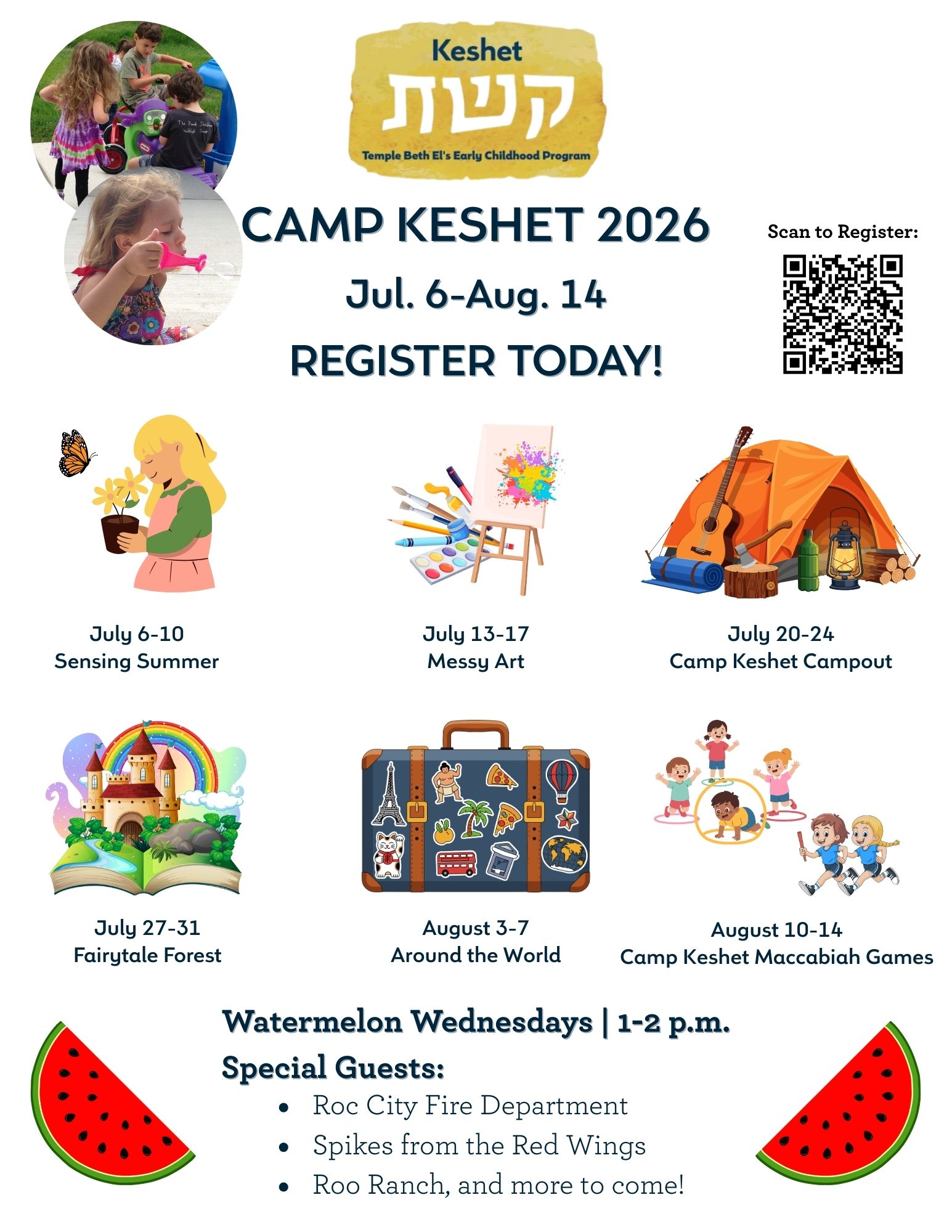 Register today for Camp Keshet 2026! The area’s only synagogue-based day camp invites all children ages 2-5. Camp runs from 9 a.m. to 4 p.m. with early drop off available.