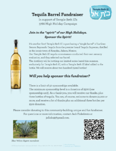 Tequila Barrel Fundraiser In support of Temple Beth El’s 5786 High Holiday Campaign Join in the “spirit” of our High Holidays. Sponsor the Spirit! It’s another first! Temple Beth El is purchasing